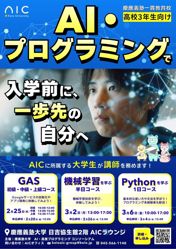 AI・プログラミングに興味がある一貫教育校の高校3年生向けに、AICに所属する大学生が講師をつとめる講習会を開催します。