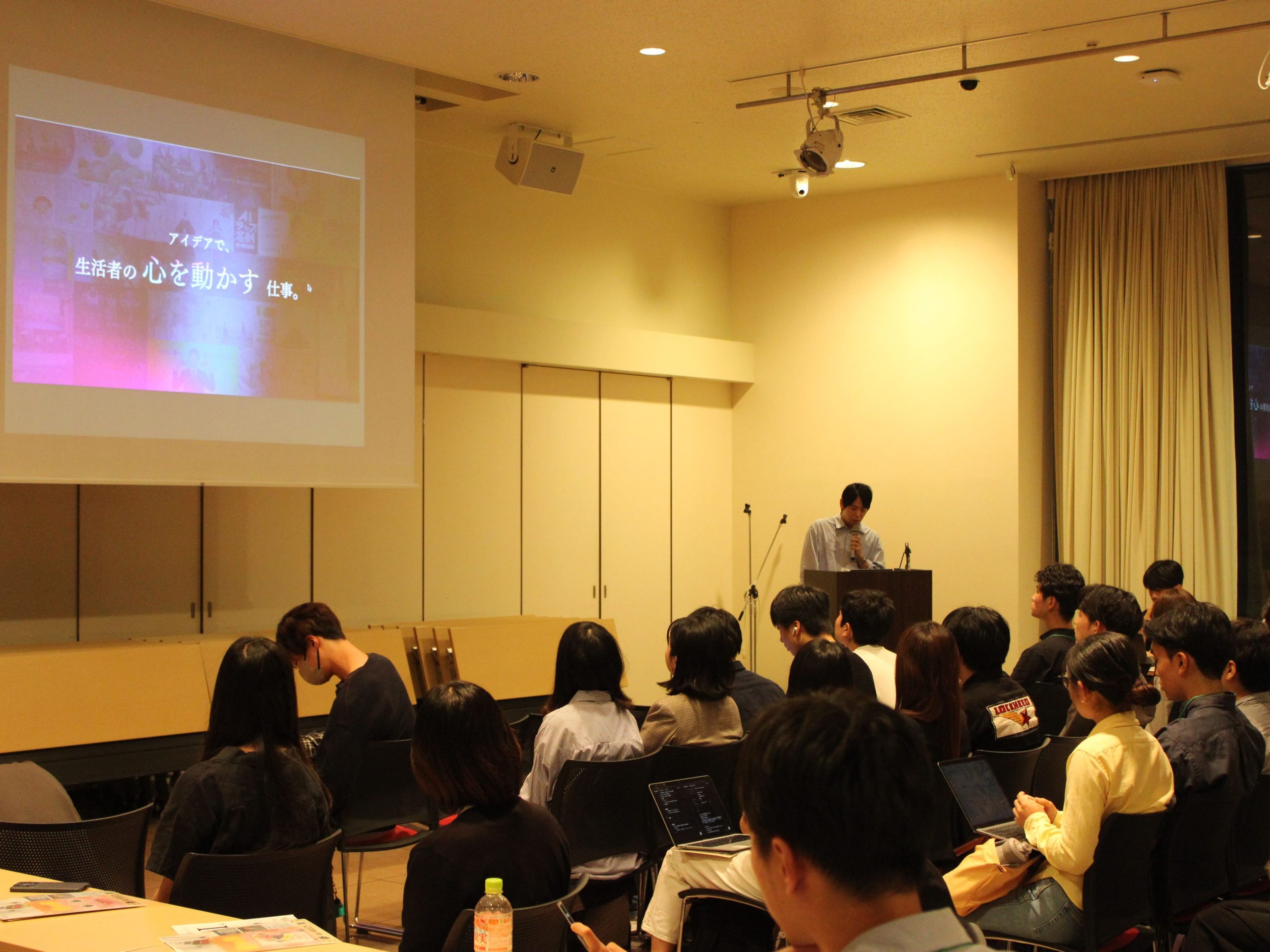 画材会社として創業後、時代のデジタル化に対応してIT・クリエイティブツールを扱うBtoB商社へと事業を転換し、国内唯一の「Apple Premium Business Partner」としての高度な導入支援を強みとする点が紹介されました。また、若手のうちからプロジェクトリーダーを任される裁量ある環境に加え、手厚い育成体制が整っていることも説明され、学生にとって具体的な成長イメージを描ける機会となりました。
