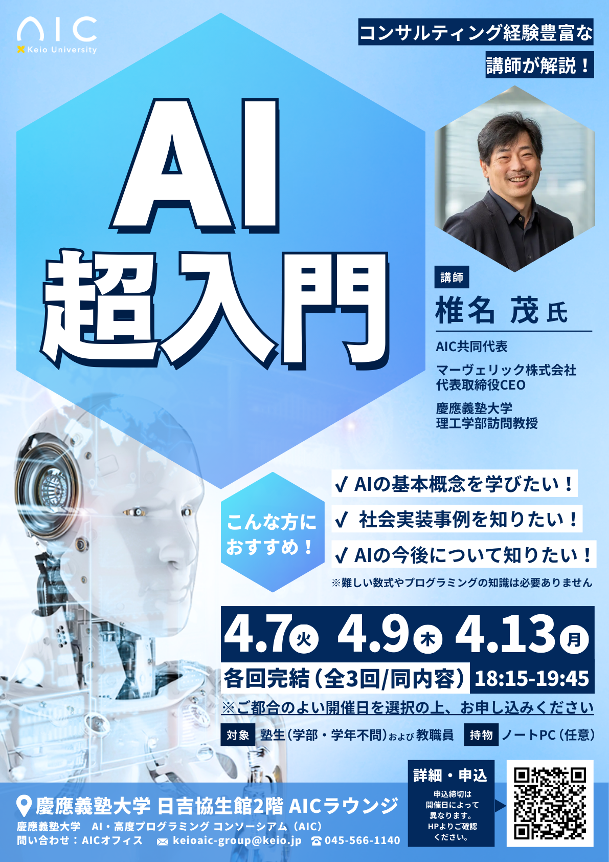 AIの超入門編として、基本的な概念や知識をぜひ身に付けましょう。皆さんのご参加をお待ちしております。