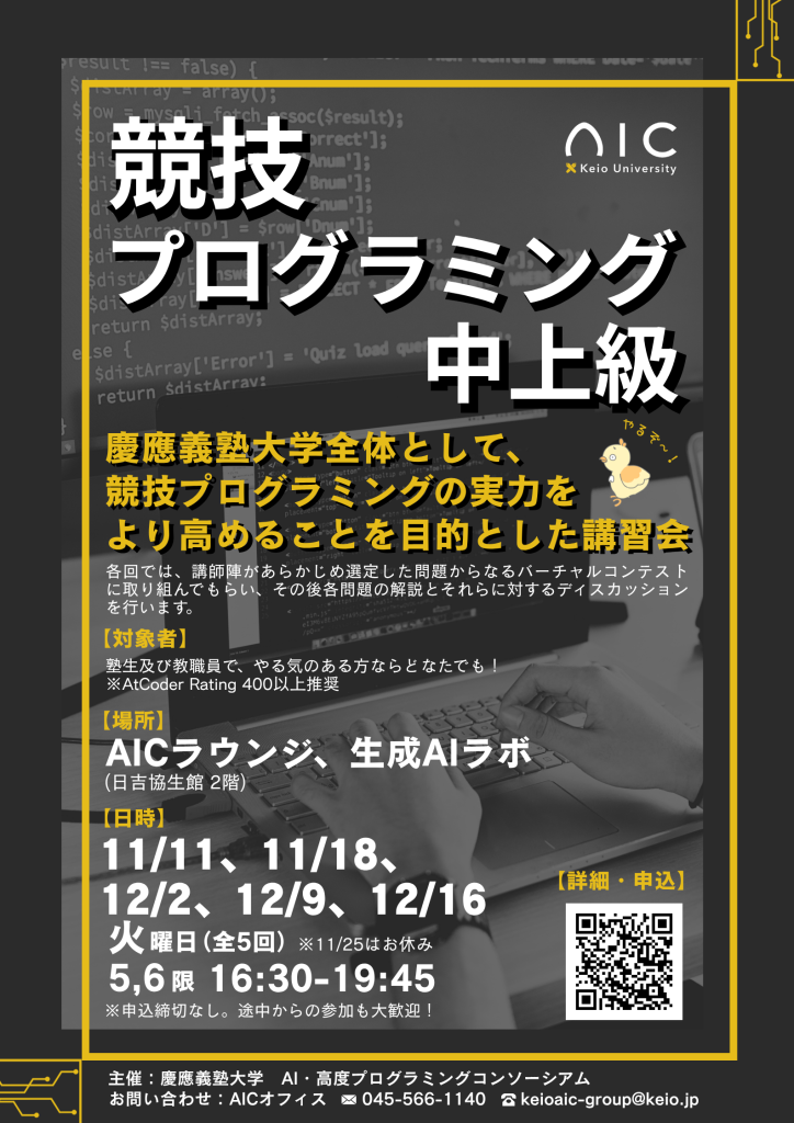 慶應義塾大学全体として競技プログラミングの実力をより高くすることを目的とした講習会です。各回では、講師陣があらかじめ選定した問題からなるバーチャルコンテストに取り組んでもらい、その後各問題の解説とそれらに対するディスカッションを行います。中級者がアルゴリズムに対する理解を深めるための問題から、上級者にむけた高度な思考力が問われる問題まで、幅広い難易度を扱う予定です。いつでもアクセス可能なヒントや解説集を公開する予定で、これらは講習会後の解き直しにも活用できます。